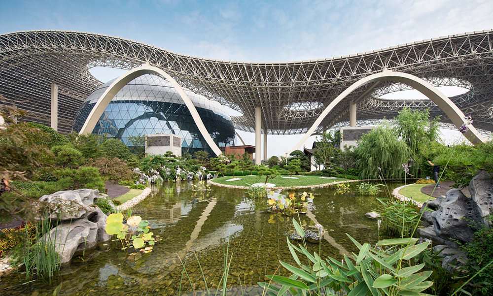 G20峰會(huì)主會(huì)場(chǎng)空中花園施工內(nèi)容包括屋頂花園景觀、仿古建筑、水體景觀積水循環(huán)系統(tǒng)等。屋頂花園整體以“西湖明珠從天降、龍飛鳳舞到錢塘”為設(shè)計(jì)理念,以典型的江南園林風(fēng)格為范本,吸收了中國(guó)古典園林中多種造景元素,詩(shī)意地闡釋了江南園林的獨(dú)特韻味。水景、植栽、石景和建筑相互輝映,傳統(tǒng)江南園林的工匠精神與哲學(xué)思考深蘊(yùn)其中,展現(xiàn)細(xì)致入微且非常玄妙的獨(dú)特美感。是國(guó)內(nèi)功能齊全,中國(guó)特色濃郁,生態(tài)環(huán)境優(yōu)美的屋頂花園。